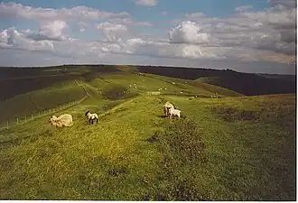 Formerly, Tan Hill had a hill figure of a white horse, sometimes called the Tan Hill Donkey because of its notably large head. Author Kathleen Wiltshire, in her book Wiltshire Folklore, published in 1975, described the figure being still partly visible "on Tan Hill, though the legs have become quite overgrown... This pony or donkey is 75 feet from nose to tail, which stretches down much like that of the Uffington horse, and its head is very large."[3][4] She went on to write that in "the 'valley' between Tan Hill and Rybury Camp stands a miniature stone circle of nine upright sarsen stones about four feet in height, in the centre of which lies a prostrate stone, about the length of a man. A pathway leads up to the 'donkey' from the circle."[4] The figure subsequently became known as Mrs Wiltshire's Donkey.[5] Whilst Wiltshire placed the hill figure on Tan Hill, another later source described it on a "medium steep slope between Tan Hill and Ryebury Camp".[5]