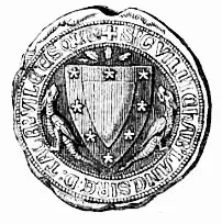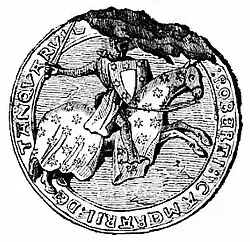 The name of Tancarville does not appear until the early twelfth century, first shown in a charter for Henry I in 1103, among the barons who are mentioned as witnesses is Raoul's son, "Willelmus de Tancarvilla".[2] It was only after this that the name of Tancarville is used and the castle appeared for the time in texts. Prior to this, the family members would have been styled: de la Ville Tancrède or Tancardi Villa.