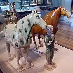 Tang dynasty tomb figures are pottery figures of people and animals made in the Tang dynasty of China (618–906) as grave goods to be placed in tombs. There was a belief that the figures represented would become available for the service of the deceased in the afterlife.[1] The figures are made of moulded earthenware with colour generally being added, though often not over the whole figure, or in naturalistic places. Where the colouring was in paint it has often not survived, but in many cases it was in sancai ("three-colour") ceramic glaze, which has generally lasted well.