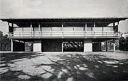 Tange's own home, designed in 1951 and completed in 1953, uses a similar skeleton structure raised off the ground as the Hiroshima Peace Museum; however, it is fused with a more traditional Japanese design that uses timber and paper. The house is based on the traditional Japanese module of the tatami mat, with the largest rooms designed to have flexibility so that they can be separated into three smaller rooms by fusuma sliding doors.[18] The facade is designed with a rhythmic pattern; it comprises two types of facade designs ("a" and "b") that are ordered laterally in an a-b-a-a-b-a arrangement. The house is topped with a two-tier roof. Kazuo Shinohara's 1954 house at Kugayama is remarkably similar in its design, although it is built with steel and has a simpler rhythm in its facade.[19]