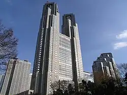 For the Tokyo Metropolitan Government Building, which opened in 1991, Tange designed a large civic centre with a plaza dominated by two skyscrapers. These house the administration offices whilst a smaller seven-storey building contains assembly facilities. In his design of a high tech version of Kofu Communications Centre, Tange equipped all three buildings with state-of-the-art building management systems that monitored air quality, light levels and security. The external skin of the building makes dual references to both tradition and the modern condition. Tange incorporated vertical and horizontal lines reminiscent of both timber boarding and the lines on semiconductor boards.[48]