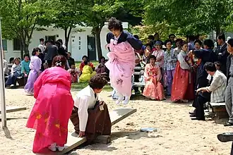 The UNESCO Convention for the Safeguarding of the Intangible Cultural Heritage took place in 2003 and South Korea joined the program a year later. In 2005 China declared some 1200 properties as intangible cultural heritage, with 16 items belonging to the Korean minority of the country, including the traditional wedding ceremony, Arirang (a folk song) and nolttwigi (a traditional seesaw game). The CHA decided that they also had to broaden the scope of intangible heritage to properties that do not have any designated 'holders', like kimchi, hangul or Goryeo ginseng.[13]