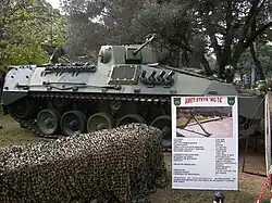A number of variants were built on the same chassis as the TAM tank. The original program called for the design of an infantry fighting vehicle, and in 1977 the program finished manufacturing the prototype of the Vehículo de Combate Transporte de Personal (Personnel Transport Combat Vehicle), or VCTP.[3] The VCTP is able to transport a squad of 12 men, including the squad leader and nine riflemen. The squad leader is situated in the turret of the vehicle; one rifleman sits behind him and another six are seated in the chassis, the eighth manning the hull machine gun and the ninth situated in the turret with the gunner. All personnel can fire their weapons from inside the vehicle, and the VCTP's turret is armed with Rheinmetall's Rh-202 20 mm (0.79-inch) autocannon. The VCTP holds 880 rounds for the autocannon, including subcaliber armor-piercing DM63 rounds. It is also armed with a 7.62 mm FN MAG 60-20 machine gun mounted on the turret roof. Infantry can dismount through a door on the rear of the hull.[28] The commander has a day sight and seven observation periscopes, while the gunner has a day sight and three observation periscopes.[29]