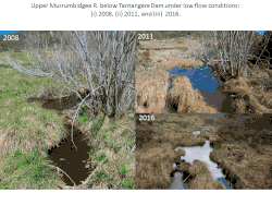 The environmental water portfolio does not allow for environmental water to be released everyday of the year from Tantangara Dam. Over the period 2005 to 2018, various environmental flow strategies have attempted to re-instate a winter-spring montane flow pattern. These approaches have attempted to improve instream habitat and ecological processes as the basis for river recovery, rather than the traditional Australian e-water approach of managing rarity of aquatic biota.