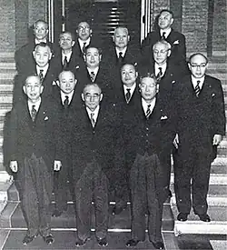After World War II Ishibashi received an offer from the Japan Socialist Party to run for the National Diet as their candidate. However, Ishibashi declined, and instead accepted a post of "advisor" to the newly formed Liberal Party.[9] Ishibashi then served as Minister of Finance in Shigeru Yoshida's first cabinet from 1946 to 1947. Ishibashi was elected to the Diet for the first time in the April 1947 general election, representing Shizuoka's second district, but less than one month later he was purged and forced to resign for having openly opposed U.S. Occupation policies.[10] Following his de-purging in 1951, Ishibashi allied with Ichirō Hatoyama and joined the movement against Yoshida's cabinet. In 1953, Hatoyama became prime minister, and Ishibashi was appointed Minister of Industry. Around this time, Ishibashi became known as a supporter of revising Article 9 of the Japanese Constitution and remilitarizing Japan.[11] In 1955, the new Liberal Democratic Party (LDP) was established as a combination of smaller conservative parties, with Ishibashi as a founding member.
