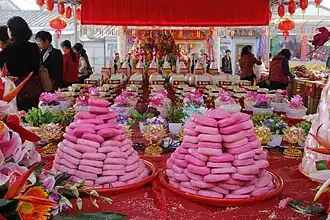 Tao kuih (Chinese: 红桃粿) is a kind of traditional food in Chaoshan area, Guangdong, China. Tao means peach in Chinese and kuih (粿) is a general name of a class of food, which is made from rice flour, flour and tapioca. “净米也,又米食也” is the explanation of kuih from Kangxi Dictionary.[1] In Chaoshan area, the housewife always make tao kuih in some big festivals, such as Spring Festival, Lantern Festival, Double Ninth Festival and so on. Tao kuih uses to sacrifice to ancestors. Tao kuih gets its name because people think it looks like a red peach. It is made for worship. In China, red peach symbolizes longevity and luck, it reflects people's aspiration when they pray.