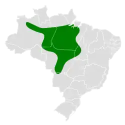 The Tapajos antpitta is found in the Amazon Basin of central Brazil, south of the Amazon and east of the Madeira River. Its range extends east past the Tapajos River to the lower Xingu River and south into Rondônia, southern Pará, and northern Mato Grosso. It inhabits humid rainforest in the lowlands. It favors areas with a dense understory such as openings caused by tree-fall, regrowing clearings, edges along roads, and especially edges along watercourses.[8]