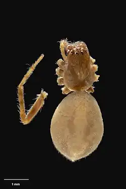 The female is recorded at 4.20mm in length whereas the male is 4.62mm. The cephalothorax and legs are reddish brown. The abdomen is reddish brown darker bands dorsally.[1]