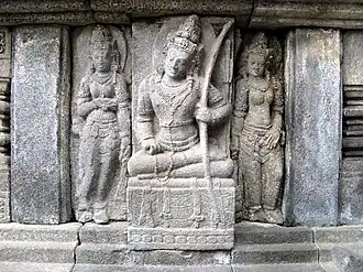 In chapter 2, the Upanishad describes the same Om mantra in terms of the characters of the Hindu epic Ramayana. The "A" is the source of Brahma who became Jambavat, from "U" came Vishnu who became Surgriva, from "M" of AUM mantra came Shiva who manifested as Hanuman, states the text.[22] The bindu of Om became Shatrughna (third brother of Rama), the nada became Bharata (elder brother of Rama), kala resonance became Lakshmana (younger brother of Rama), the kalatita became Lakshmi who manifested as goddess Sita (a Shakti, wife of Rama), and beyond all this is the last subtle part of Om which is Supreme Self manifesting as Rama.[22][23]