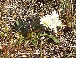 Taraxacum arcticum is a moderately long-lived perennial with a whitish taproot and a rosette of five to eight green leaves, sometimes growing solitarily and sometimes somewhat matted. The leaves are 5 to 10 cm (2 to 4 in) long and 1 to 1.5 cm (0.4 to 0.6 in) wide, and have several deep lobes and a long triangular final lobe. The inflorescences grow direct from the rosette, each with a long pinkish stem that often curves downwards and has transverse wrinkles. Each flowering stem bears a single flower head consisting of multiple florets which are bisexual; the ligules are white or creamy-white and have a purple streak on the underside. The brownish-black fruits have a number of shallow ridges and are capped by white pappi which form parachutes.[2]