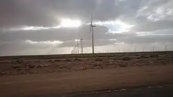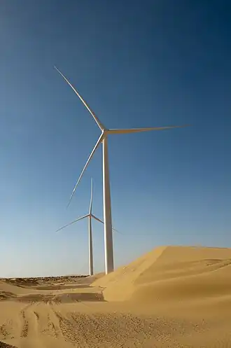 Tarfaya Wind Farm is a wind farm in Morocco, located in 20 km from Tarfaya.[1] It was developed by Tarec (Tarfaya Energy Company), a 50/50 joint venture of Nareva Holding and International Power Ltd. Tarfaya Wind Farm is owned and operated by a 50:50 joint venture between the GDF SUEZ and Nareva Holding and it is Africa's 2nd largest capacity wind farm after Lake Turkana Wind Power Station,[2] with 131 wind turbines, each generating 2.3 Megawatts of power, and a total installed capacity of 301 MW.[3] It was on the list of ten “Most Outstanding African Projects in 2015”, a ranking by Jeune Afrique magazine. The park was commissioned in December 2014 after two years of work and investment of 5 billion dirhams. Its constructor and operator is Tarec, which sells the power generated to the National Electricity Office. [4]