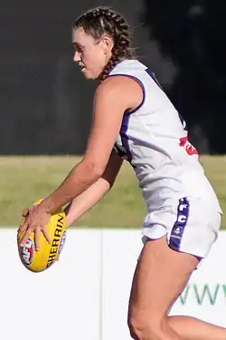 Tarnica Golisano (born 21 September 1996) is an Australian rules footballer who played for the Fremantle Football Club in the AFL Women's competition. Golisano was recruited by Fremantle as a free agent in October 2016.[1] She made her debut in the thirty-two point loss to the Western Bulldogs at VU Whitten Oval in the opening round of the 2017 season.[2] She struggled to maintain a spot in the best 23 players and finished the season with four matches,[3] before being delisted at the end of the 2017 season.[4] Golisano is a qualified personal trainer/gym instructor.[5]