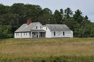 The Tarr–Eaton House stands in Harpswell Center, on the west side of Harpswell Neck Road (Maine State Route 123), in a field just north of the 1750 Harpswell Meetinghouse, a National Historic Landmark. It is a single-story wood frame structure, with a side gable roof, a large central chimney, five-bay facade, clapboarded exterior, and a foundation of concrete and rubblestone. A single-story shed-roof ell extends northward from its rear northeast corner. The main facade faces south, consisting of four windows with simple surrounds, two on either side of the main entrance, which is topped by a four-light transom window. A porch extends across the eastern facade, supported by simple square posts. The interior has a typical center-chimney plan, with the entry vestibule housing a narrow and steep winding staircase, with parlor spaces to either side, and the kitchen behind. Fireplaces feature Federal period mantels, and the interior retains other period finishes.[2]