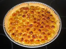 The type of pastry used for tarte aux mirabelles varies. The most frequently mentioned in recipes is pâte brisée,[5][6] but other sweet pastries – pâte sablée and pâte sucrée – are specified by some cooks,[7][8][9] and unsweetened shortcrust and puff are also used in some recipes.[10][11] In Beaulieu-sur-Dordogne, Elizabeth David encountered a tarte aux mirabelles made with yeast pastry: "Those little round golden plums of early autumn on their light brioche-like base made an unexpected and memorable end to our outdoor feast".[4]
