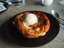 The tarte Tatin (French pronunciation: [taʁt tatɛ̃]) is a pastry in which the fruit (usually apples) is caramelized in butter and sugar before the tart is baked. Named after the Tatin sisters who invented it and served it in their hotel as its signature dish, it originated in France but has spread to other countries over time.