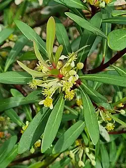 - Tasmannia xerophila subsp. robusta Raleigh[9] commonly known as Errinundra pepper, is a shrub to small tree up to 4 m (13 ft) high with leaves 70–140 mm (2.8–5.5 in) long and 20–30 mm (0.79–1.18 in) wide on a petiole 3.5–6 mm (0.14–0.24 in) long, and female flowers with up to 8 carpels containing 3 to 7 ovules per carpel.[10][11]