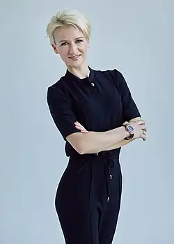 Volosozhar was born in Dnipropetrovsk, Ukrainian SSR, to parents of Russian origin – her mother was born in Kaliningrad and her father in Nizhny Tagil.[53] Her father is in the army and she also has a sister.[10] Her first language is Russian and she also understands Ukrainian very well, although she does not speak it perfectly.[53] Volosozhar was eligible for expedited Russian citizenship,[54] which she received in December 2010.[53] Volosozhar also communicates in English. In February 2015, it was publicly announced that she and her skating partner, Maxim Trankov became engaged.[55] They got married on 18 August 2015.[56] On 23 September 2016, Volosozhar confirmed that she and Trankov were expecting their first child, a daughter, due February 2017. On 16 February 2017, Tatiana gave birth to their daughter, Angelica Maximovna Volosozhar-Trankova. On 27 January 2021, Volosozhar confirmed that she and Trankov were expecting their second child, a son, due end of May/early June 2021.[57] On 27 May 2021, Tatiana gave birth to their son, Theodore Maximovich.[58][59]