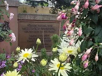 After the expulsion of Germans from Czechoslovakia in 1945, they lived in Schloss Johannisberg, the family's estate in Geisenheim, in the Rheingau. It had been destroyed by bombing in 1942. They rebuilt the estate and ran the winery. The East Wing was restored, but not as living quarters, rather it was turned into a hall for indoor tennis. In collaboration with Henkell & Söhnlein, a winery and member of the Oetker Group, they created the sparkling wine, "Fürst von Metternich".[1] In 1974, they shared ownership of the castle and the winery with the Oetker Group. After her husband's death in 1992, she sold the property completely to Oetker, but retained the right to live on the premises.[3]