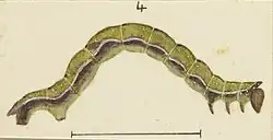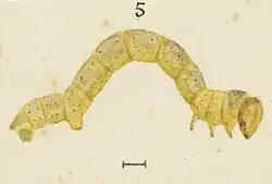 The length of the newly-emerged larva is under 1-10th inch; it is stout, cylindrical, with the head and segment 2 very large, thence tapering to segment 5, and afterwards becoming slightly stouter; the anal flap is bifid, and the anal prolegs largely extended laterally; general colour bright yellow, slightly brownish on back, especially posteriorly; segmental divisions very distinct, deep yellow; a few very minute black warts.[8]