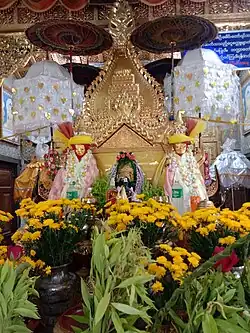 Then came the fourth day of the festival to celebrate 'the ritual shower', a ceremony of washing the idols of Taungbyon brothers. The general procedure starts with taking the two statues from the palace to the place of the event where the statues are washed alongside the washing and cleaning of the nats' items like betel cups and boxes. They are carried on the royal palanquin (ဝေါတော်) by men of guardian militia. This procession is led by the nat chieftain, the dignitaries, gong players to play music, and lines of guards dressed up as the army of the king Anawrahta. On reaching the pavilion where the ritual will take place, the palanquin is left at the entrance and the palace guardians shower the two statues on the altar, then changes the clothes. Libation and other offerings are made as part of the ritual. Afterwards, on their return to the palace, the paying-respect of the two brothers' idols to the Buddha is carried out by rocking the palanquin back and forth in the direction of the pagoda, called U Taik (ဦးတိုက်), for a certain time.[18]