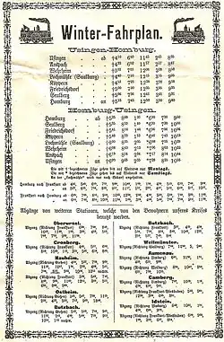 - ^ a b "Geschichte der Taunusbahn" (in German). Verkehrsverbandes Hochtaunus. Archived from the original on 19 August 2017. Retrieved 30 March 2018.