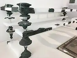 The banquet hall at the North end had space for seven couches. One of these was made of bronze and decorated with silver ornaments and precious stones. The floor of the hall was probably decorated with a black and white mosaic. At its centre a splendid hunting scene was laid with minute polychrome tesserae depicting a hunting scene with two knights and a spear-bearer on either side of a wounded bear. The scene, dominated by a large tree, is completed by a dog, a feline and a wild boar. The couch is currently on display in the National Archaeological Museum of Reggio Calabria.[5] The house was demolished and the materials reused for the construction of the great sanctuary.