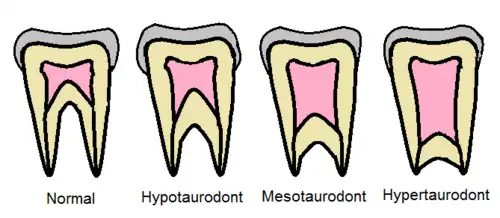 - ^ a b c Jafarzadeh, H.; Azarpazhooh, A.; Mayhall, J. T. (May 2008). "Taurodontism: a review of the condition and endodontic treatment challenges". International Endodontic Journal. 41 (5): 375–388. doi:10.1111/j.1365-2591.2008.01388.x. ISSN 0143-2885. PMID 18363703.