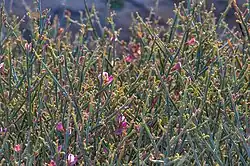 Taverniera spartea is a perennial leguminous shrub native to arid regions stretching from the Arabian Peninsula through Iran to Pakistan. It thrives in sandy or rocky deserts and dry shrublands. It is a small, silky shrub with reduced or absent trifoliate leaves, pink to pale purple flowers, and spiny, segmented fruits.[2]