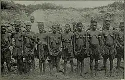 Women in these cultures often shave their heads similarly to men, though they may retain a small tuft of hair on the crown, from which they allow one or two long strands to grow. These strands are frequently decorated with beads and may be styled into pigtails. Men may adorn themselves with headgear made from the stomachs of cows or calves, shaped while still warm, which drapes over their shoulders and is often embellished with beads, metal fringes, and decorative tin pieces.[5]