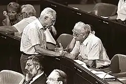 Toubi is remembered as one of the two MKs (the other being Meir Vilner) who exposed the Kafr Qasim massacre, and is seen by the Israeli left as a fighter against racism.[6] He is regarded as father of the 'state of all its citizens' formula, which he brought up when the Knesset debated the Basic Law in 1985. It now appears in the Meretz platform, and is supported by the left, the post-Zionists and all the Arab MKs.[7] He is seen less favorably by the Israeli right, although he is remembered as more of a respected adversary than a militant anti-Zionist (such as Azmi Bishara).[8]