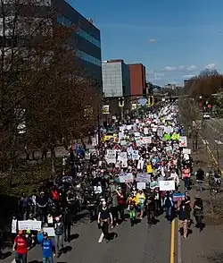 More than 1,000 protests attended the march in Portland.[81] The rally started at 1:30 pm at Terry Schrunk Plaza, and returned to the venue at 2:30 pm. The route for the march is said to have been similar to that of the Women's March on Portland that was organised in January 2017. Post-march activities were said to have continued at the Plaza until 4 pm.[82] The Facebook page for the Portland march has shown that more than 1,600 people have attended.[83][84]