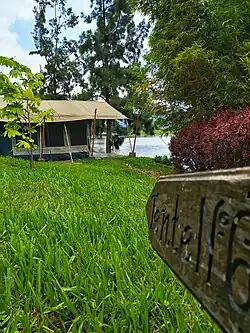 The island was officially opened to the public on 22 August 2015, in conjunction with unveiling four new activities within the Virunga National Park, presided over by the Minister of Tourism and Culture, Elvis Mutiri Wa Bashara.[5] As reported by Radio Okapi, the Institut Congolais pour la Conservation de la Nature (ICCN) planned and executed the development of modern amenities on Tchegera Island, which included the construction of safari-style tented camps, a conference facility, and a restaurant catering to the island's visitors.[5] Drawing inspiration from traditional Bantu architectural techniques, the island comprises approximately six opulent tented camps; each outfitted with en-suite bathrooms, hot running showers, and flush toilets.[6][5] The tents were also equipped with power generators, charging ports, electric hair dryers, and high-quality torches.[5] Additionally, there are bungalows and common areas.[1] The island's energy and water systems are sustainably supported by solar panels, biogas installations, and reverse osmosis water filtration units.[5][1]