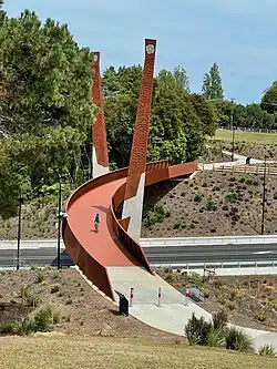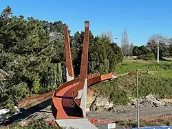 Installation of a 71-metre (233 ft) curved pedestrian/cycleway bridge weighing over 200 tonnes, made up of five weathered-steel sections,[17] 70 metres (230 ft) north of Peacocke Bridge, was started in 2022. The bridge crosses the extension of Wairere Drive, to maintain the Te Awa link to Hamilton Gardens.[8] Māori design is reflected in the bridge, with two 25-metre (82 ft) steel masts, representing a waharoa (gateway), and influenced by a taurapa (carved waka sternpost). The motif is a takarangi (intersecting spiral), as seen on sternposts, denoting a threshold.[18]
