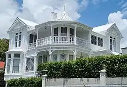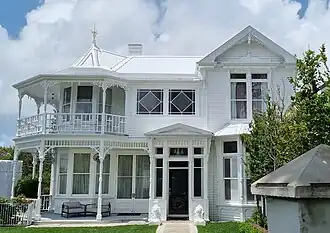 The building is a large two-storey timber Italianate corner bay villa, popular with wealthy merchants in Auckland.[1] It had "a largely symmetrical design with a projecting gable wing on each street frontage, joined by a double return verandah."[1] There were decorative elements including a turned columns, fretwork, and a front portico.[1] It also had stained glass used throughout the upper window panes. Internally, there were ten rooms–five upstairs, five downstairs, arranged around central hallways.[1]