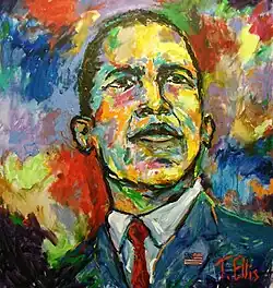 One of Ted Ellis' more famous works is an abstract depiction of Barack Obama's signature 'hope' pose. Ellis painted the portrait in honor of Obama's 2008 Presidential inauguration. In Obama, the 44th President, Ellis uses red, blue, yellow, and green acrylic paint to portray Obama as someone who unites people across lines of color, ethnicity, and religion.