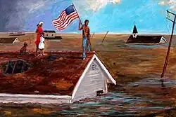 Ellis was allowed to enter the city two weeks after the flood waters subsided in order to survey the damage to his mother's home in the Lower Ninth Ward and salvage her possessions.[11][13] While travelling among the destroyed houses and deserted city, Ellis witnessed a lone man repairing his home's roof. The contrast resonated with Ellis, and he memorialized the hope he saw in the man's actions through his piece Surviving Katrina.[11] The scene is of rising floodwater that traps a family on their house's roof while the father holds up the Flag of the United States, a flag that to Ellis symbolizes the need for the nation to come together to aid those affected by the storm.[8][13]
