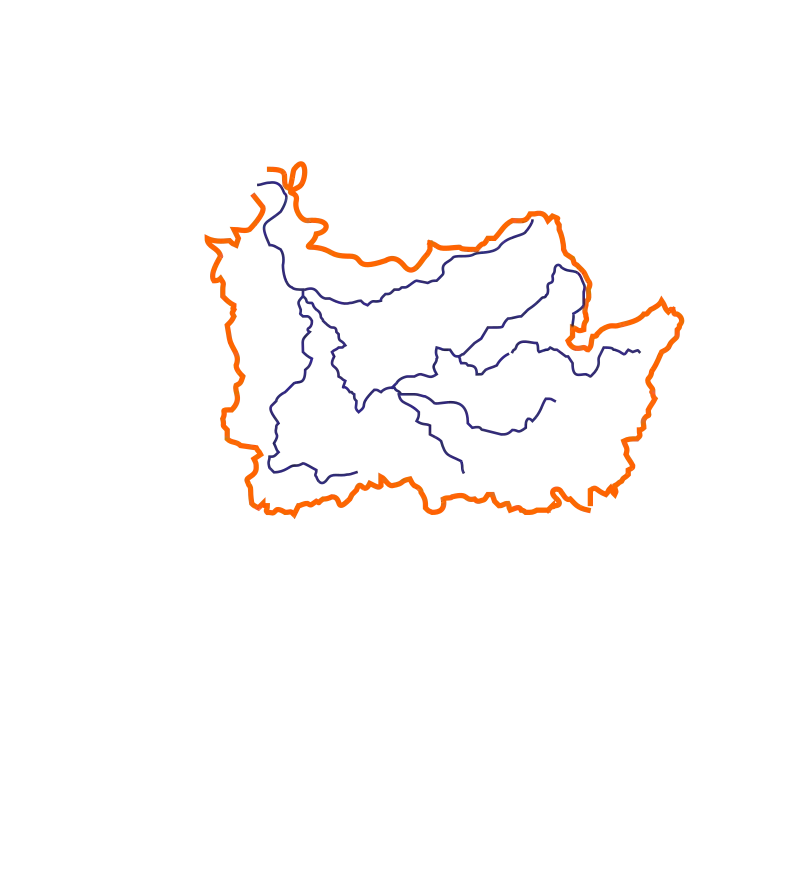 Map showing the Teeswater River, part of the Saugeen River basin in Bruce County, Ontario. The orange line shows the drainage basin of the river system.[4]