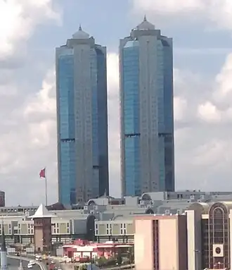 Koza Plaza also known as the Tekstilent Plaza is a mixed-use skyscraper complex located in the Tekstilkent cooperative of the Esenler district in Istanbul which is Europe's largest wholesale retail facility of textiles. The plaza, which was started to be constructed by Garanti-Koza, began operating in 2000.[2] Both buildings consist of 44 floors. Its official name used to be Koza Plaza,[3] but after the appointment of a trustee to Koza Ipek Holding, this usage was abandoned. It is among the tallest buildings in Turkey. It is also one of the largest textile centers in Europe.[4]