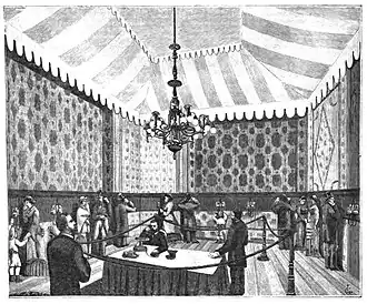 The introduction of the telephone in the mid-1870s included numerous demonstrations of its use for transmitting musical concerts over various distances. In one particularly advanced example, Clément Ader prepared a listening room at the 1881 Paris Electrical Exhibition, where attendees could listen to performances, in stereo, from the Paris Grand Opera.[3] The concept also appeared in Edward Bellamy's influential 1888 utopian novel, Looking Backward: 2000-1887, which foresaw audio entertainment sent over telephone lines to private homes.