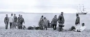 During the summer of 1892, 171 reindeer were purchased in Siberia and landed at the station. At the time of landing at Port Clarence, two were lost by straying away. Twelve were so injured by transportation from Siberia that they either died or had to be killed. During the year, 13 others died from injuries received while fighting, or slipping upon the ice, making a total loss of 27. There was a gain of 79 fawns, born in the spring of 1893, leaving, on June 30, 1893, 222 reindeer in the herd. During the summer, 127 additional reindeer were purchased in Siberia, of which 124 were safely landed at the station, making a total, in September 1893, of 346. During the winter, the superintendent of the station trained 12 deer to draw sleds, and with his two teams of reindeer, made a successful trip to the mission station at Cape Prince of Wales, 60 miles (97 km) distant.[9]