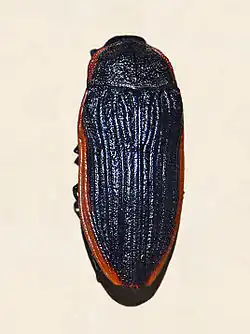 Temognatha grandis can reach a length of about 55 millimetres (2.2 in).[2] The body colour is black, with a yellow border on each side. Head and legs are black. Elytra are punctato-striate. These beetles are florivore and feed on the flowers of various trees and shrubs (especially Angophora hispida and Leptospermum species).[2][3][4] Larvae are wood-borers of Eucalyptus gracilis, Eucalyptus oleosa, Eucalyptus uncinata and Eucalyptus foecunda.[3]