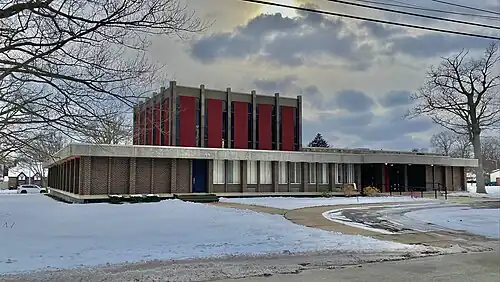 By 1965 the congregation had approximately 175 families, and had outgrown its building on Cedar Avenue, which had inadequate facilities, and too few (and unsafe) classrooms.[19] In 1961 Beth Israel had acquired from the New York Power Authority 2 acres (8,100 m2) of land at College Avenue and Madison Avenue, valued at approximately $100,000, in exchange for 1-acre (4,000 m2) of land the Authority needed in Beth Israel's cemetery.[19] Funds were raised for a new building,[20] and in 1966 construction began on facilities on College Avenue. The work was completed in time for High Holiday services to be held there in 1967.[3][1][2]