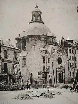 The church showing significant damage to the facade received during the Paris Commune