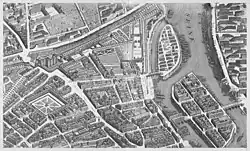Detail from the Turgot map of Paris showing the area around the church in the 1730s with the church half a block from the Bastille fortress