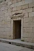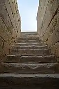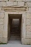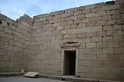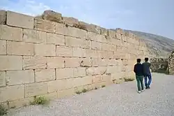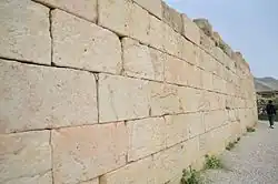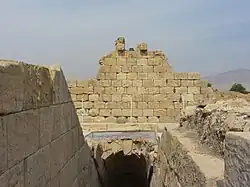 The Temple of Anahita is a large rectangular room in the shape of a cube in a depression 6 meters above the ground, each side of which is nearly 14 meters. It is built of carved stones without mortar, double-walled, and in the Achaemenid architectural style. These stones are connected to each other with iron fasteners. A staircase from the palace was also connected to this temple. The temple has no roof and the purpose was to bring the water of the Shapur River, which flows 250 meters away, into the temple, so that after flowing inside the temple, it would be discharged through a Qanat.[8][9]