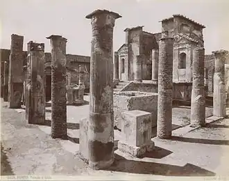 The Temple of Isis is a Roman temple dedicated to the Egyptian goddess Isis. This small and almost intact temple was one of the first discoveries during the excavation of Pompeii in 1764.[1] Its role as a Hellenized Egyptian temple in a Roman colony was fully confirmed with an inscription detailed by Francisco la Vega on July 20, 1765. Original paintings and sculptures can be seen at the Museo Archaeologico in Naples;[2] the site itself remains on the Via del Tempio di Iside. In the aftermath of the temple's discovery many well-known artists and illustrators swarmed to the site.[3]
