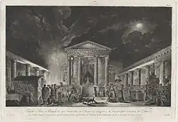 In the 18th and early 19th centuries, the Temple of Isis in Pompeii served also as the subject of written depictions and illustrations, many of which romanticized and exoticized the Egyptian cult center.[22] One particular book written by Giambattista Piranesi in 1804, Antiquités de Pompeìa, includes illustrations of Egyptian symbols which are not historically accurate to what has been excavated at Pompeii and depictions of the Temple of Isis at a much larger than factual scale.[22] Another illustration of the Temple of Isis from Jean Claude Richard de Saint Non's 1782 volume of Voyage Pottoresque, ou, Description desroyaumes de Naples et Sicile also features a gross misrepresentation of the temple's size.[22] Its intense shadowing and looming clouds only contribute to the Egyptomanian tendency to mystify and marginalize Egypt as it compares to post-Enlightenment European notions of religion. Photographs of the temple's ruins, taken by archeologists and compiled in the "Pompeii in Pictures" webpage demonstrate the disparity in size between these illustrations and the physical space itself.[29]