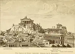 ![]() Drawing of the Capitoline Hill by Georg Rehlender, with the Temple of Juno Moneta at upper right, above the Tabularium. | |