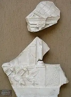 Ancient sources agree that the temple was constructed on the Arx, the northern of the two peaks of the Capitoline hill (summa ... in arce, according to Ovid, Fasti 6.183), but no remains of the building have been certainly identified and its precise location has been described as "one of the great enigmas in the topography of ancient Rome".[10][1] Some scholars believe that it stood on the site now occupied by the church of Santa Maria in Aracoeli,[10][11] although ancient walls discovered in the cellars beneath the church appear to belong chiefly to shops and houses.[12] Others have argued that the temple was situated in the garden to the southeast of the church, where other walls of tufa and concrete are visible.[13][14] Although Roman tradition placed the founding of the temple in the 4th century BC, two fragments of Archaic terracotta decoration found in the garden suggest the existence of an earlier building dating to the late 6th or early 5th century, although whether it represents an earlier phase of the temple is unclear.[14]
