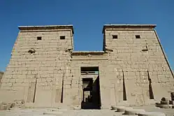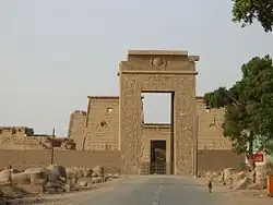 The Temple of Khonsu is an ancient Egyptian temple. It is located within the large Precinct of Amun-Re at Karnak, in Luxor, Egypt.[1] The edifice is an example of an almost complete New Kingdom temple, and was originally constructed by Ramesses III on the site of an earlier temple.[2] The gateway of this temple is at the end of the avenue of sphinxes that ran to the Luxor Temple. In Ptolemaic times, Ptolemy III Euergetes constructed a great gateway and enclosure wall for the temple; only the gateway now remains (see below). Inscriptions inside the forecourt of the temple were made in the time of Herihor.